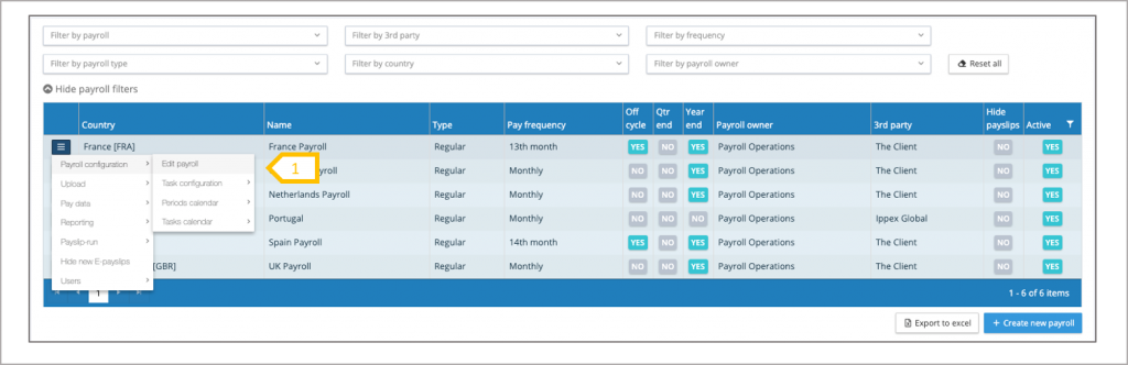 1. Click on edit payroll, this will show the payroll configuration screens (general, authorization, payroll currency, 3rdparty assignment and workspaces)