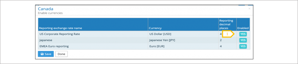 From the payroll menu, using the action button next to the payroll there is a menu item called reporting and a sub-menu item ‘currencies’ with two options ‘enable currencies’ and ‘exchange rates’. Before exchange rates can be added to a payroll the currencies need to be set-up and enabled.