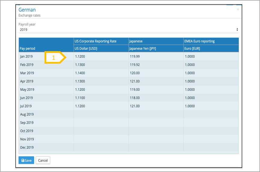 From the payroll menu, using the action button next to the payroll there is a menu item called reporting and a sub-menu item ‘currencies’ with two options ‘enable currencies’ and ‘exchange rates’. Before exchange rates can be added to a payroll the currencies need to be set-up and enabled.