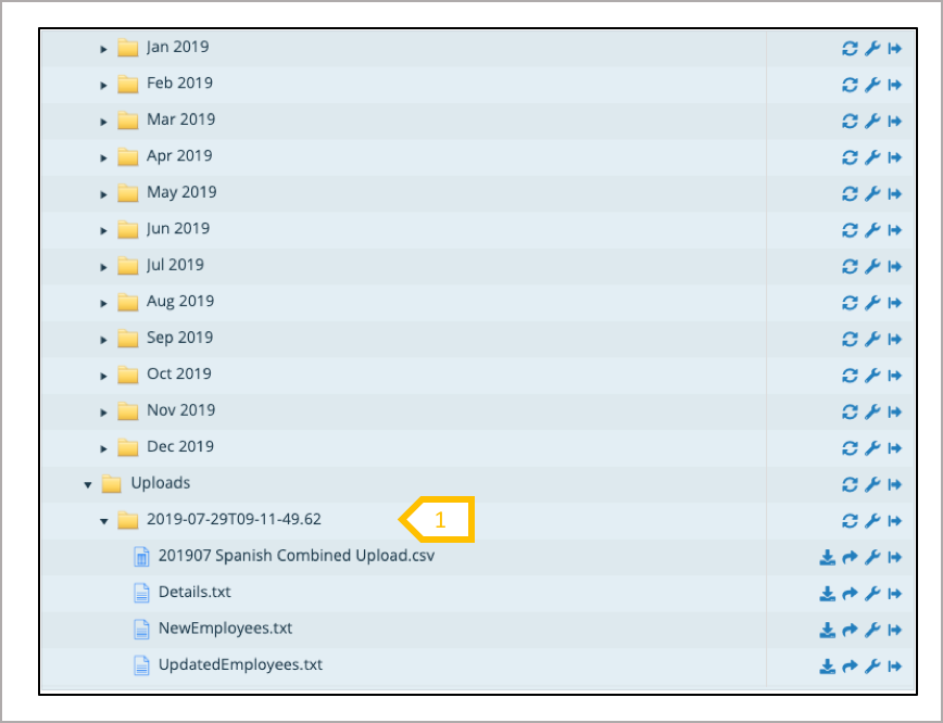 1. For each employee upload to payroll will generate a folder, containing a file called details (details the upload parameter set), the upload file used in the process, new employees generated and a file detailing the employees updated.