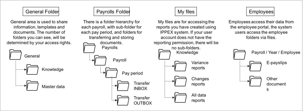 File management system is used by a number of functions within the IPPEX Cloud system. There are four main areas of Files; General folder, payroll folders, my files and employees.