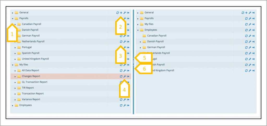Any number of sub-folder hierarchies can be created under the General folder, this is the responsibility of the tenancy administrator. Access rights have to be granted for each folder, based on payroll groups.