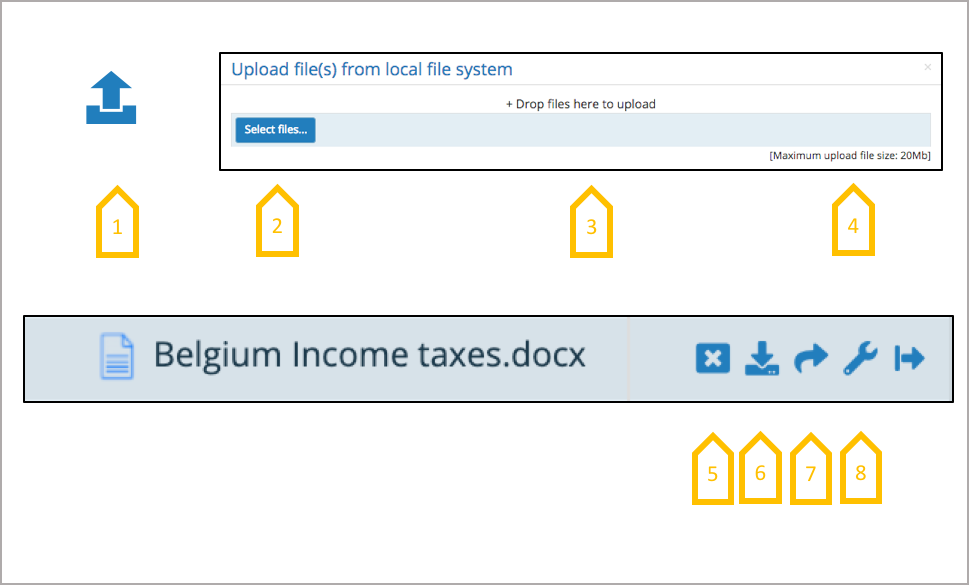With the appropriate access rights files can be uploaded to a folder, selecting a file from a local file system or drag and dropping a file into the upload area. File can be deleted, downloaded, viewed or managed (change file name).