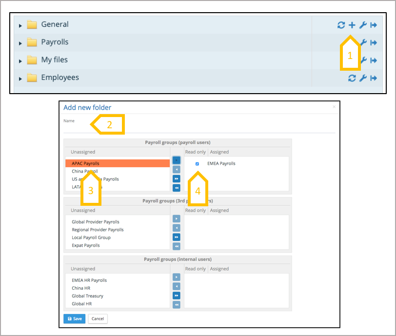 3. Select which payroll, internal and third party user’s payroll groups can access the folder.