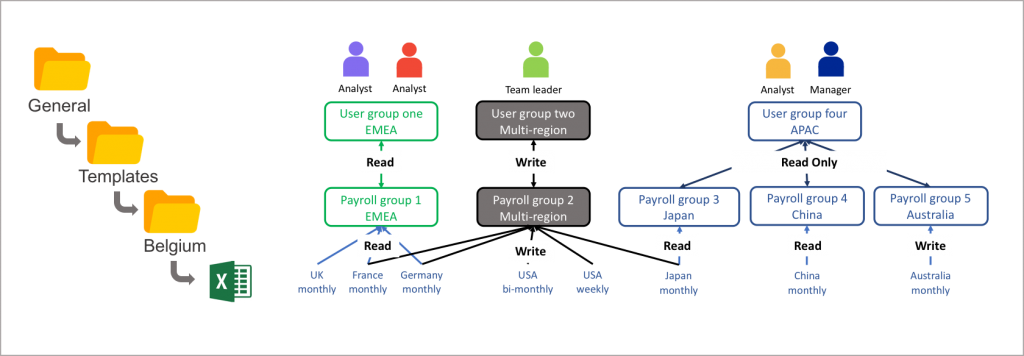 It is important to know which user groups have access to the payroll group, as a user could have multiple paths to a payroll. A user via their payroll group has to be granted access to each level of the folder hierarchy to see the lowest folder structure.