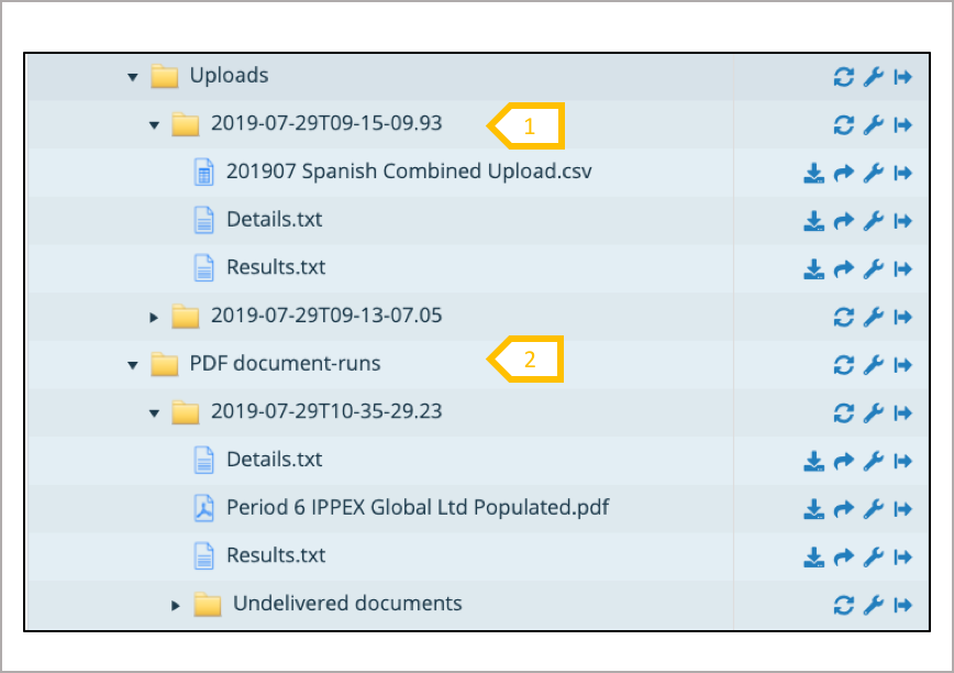 2. For each PDF document-run a folder is generated, containing a file called details (details the document-run parameter set), the document file used for the run and results, which lists errors, those document selected to be ignored and successful documents. In addition, any documents rejected by the process are placed in the undelivered documents folder.