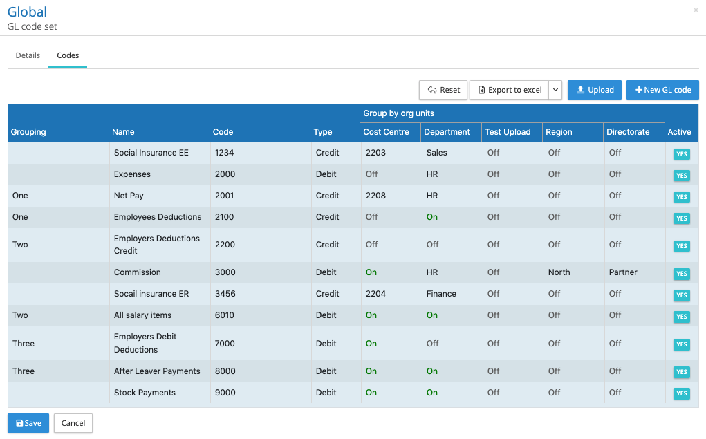 GL Code Set Upload: Export to excel an upload template format file, add new grouping/name/code or amend existing ones, for each organisation unit enter either false, true or the organisation unit value for that entry. Upload the completed template.