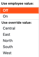 - Use override value: Select a fix organisation unit value (this will replace the employee value)