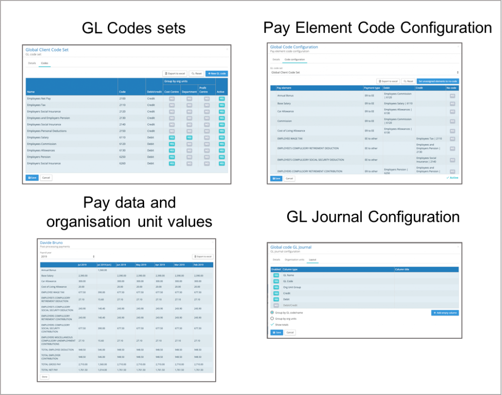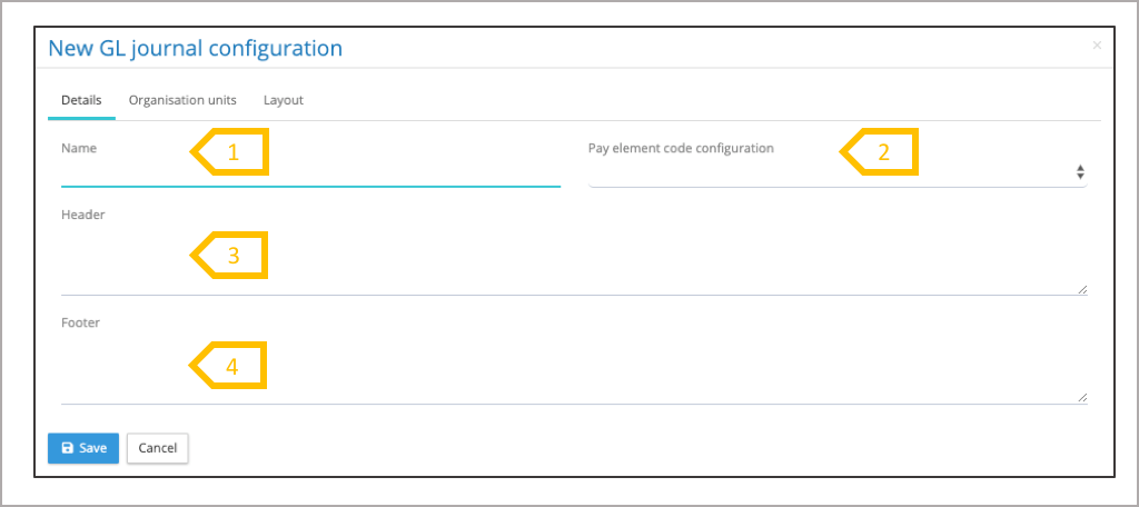GL Journal Configuration – Defines which Pay Element code configuration is being used for the report, the order in which GL codes and organisation units are grouped by and the layout of the report.