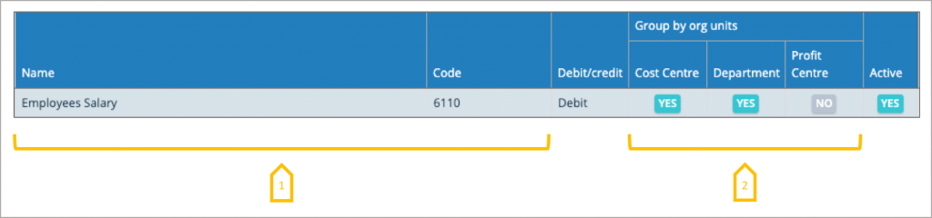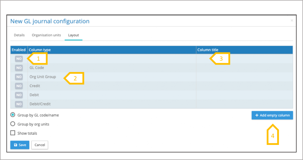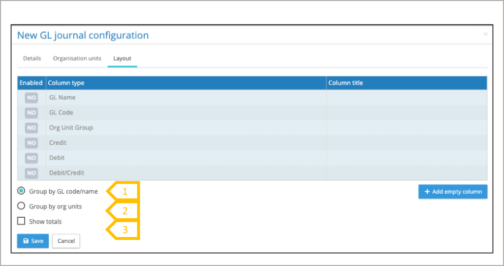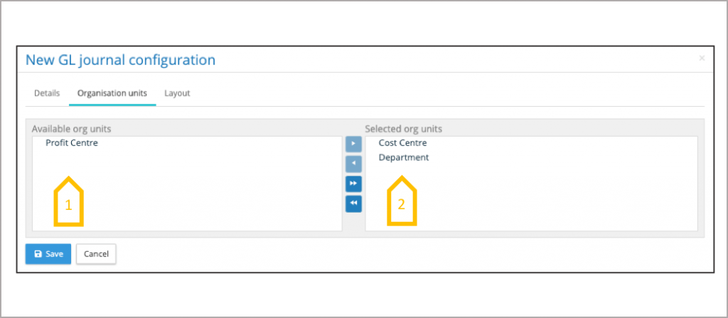 2. Defines which org units used to group the GL code in the GL Journal, please note this does not define the org unit order, this is defined by the GL Journal Configuration.