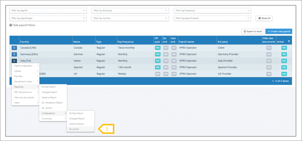 To start a GL Journal configuration go to Payrolls, from the action button click on reporting → Configurations → GL Journal. This will bring up a list of GL Journal configurations already created and the option to create a new GL Journal.