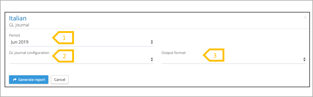 2. Select the GL Journal report configuration. 3.Select the report output format, Excel or CSV.