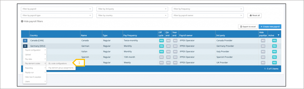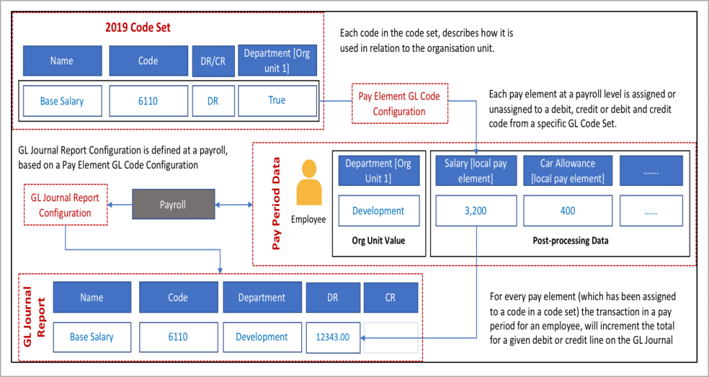 Pay Element GL Code Configuration: For each payroll, a GL Code Configuration can be created which binds pay elements to the GL codes within a specific code set.