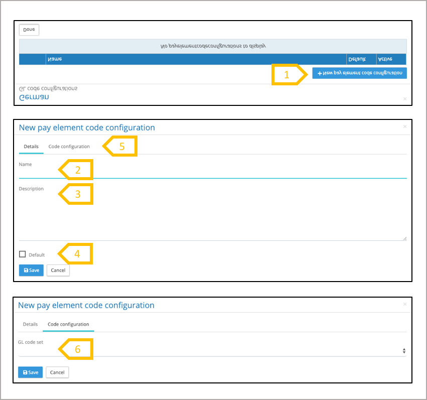When creating a GL code configuration for a new payroll, the GL code configuration list will be empty and the first action will be to click on ‘+ new pay element code configuration’. Complete the details section, and when selecting the code configuration the system will prompt you to select the GL Code Set you would like to use in this configuration.
