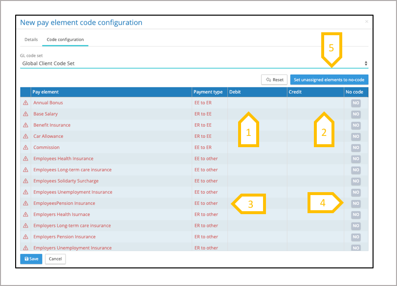 For each pay element the appropriate Debit, Credit, Debit and Credit or no code has to be selected. To save a GL Code Configuration all pay elements have to assigned to one of these four options. When a configuration is complete, and a new pay element has been added to the payroll the code configuration will require updating. The new element can be easily identified, it will be in red indicated it requires coding. Creating a configuration for the first time all elements are displayed in red with a warning symbol to the left.
