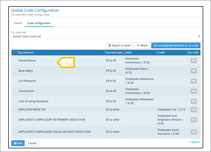 When creating the code set and you discover a you are missing a debit or credit code in the code set, to save that configuration, temporarily set that pay element to ‘no code’ so that all of the pay elements have been assigned to something and save the configuration. Go to you GL Code Set and add the new debit or credit code, revisit the GL Code Configuration, toggle the no code to remove this from the pay element and select the newly added debit or credit code.