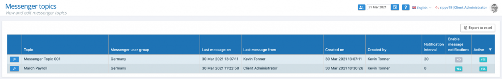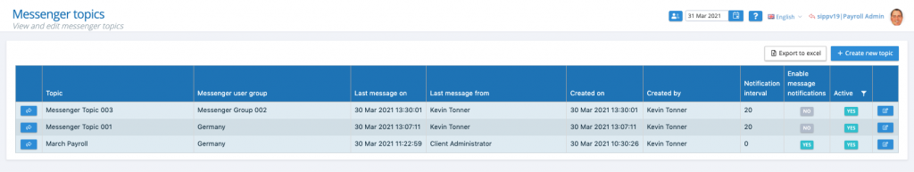 A user with who has been given the messenger manager privilege, will have additional functionality when viewing messenger list, to create new topics and to edit topics.