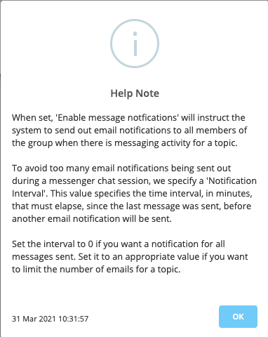 Topic name, this should describe the type of dialogue to be shared with the group, e.g. payments processing. Enable message notifications and notification interval – Click on the ? symbol and the following message will appear providing guidance on setting notifications.