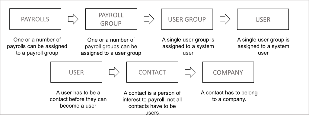 User groups and payroll groups are structured to allow and restrict access to functions and payrolls, the file management is controlled by payroll groups and tasks, issue, reminders and notes are controlled by user groups. It is important to map all of the users, companies and payrolls before structuring the payroll and user groups