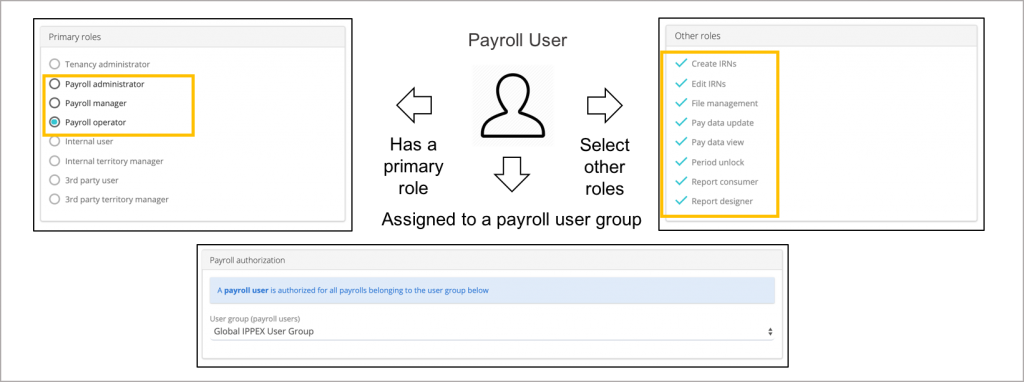 A system user’s access to the system is controlled by their user type, their primary and other roles, the user group and payrolls group they are assigned to. It is important to understand how a payroll is linked to a user and what privileges a user can be given. The IPPEX system offers flexibility, as a consequence there are multiple ways in which to achieve a similar outcome.