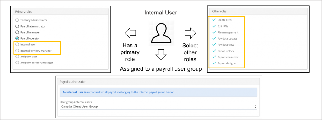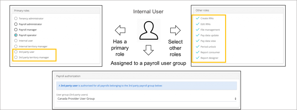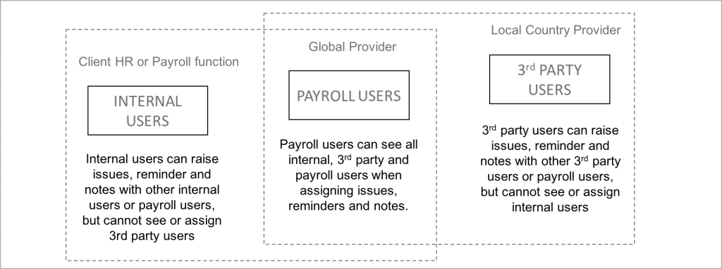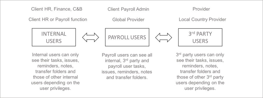 - There are three types of users, internal, payroll and 3rdparty users. This are used to group organisations, for example an end client operation is assigned to an internal user groups, a global payroll operation assigned to the payroll user type and the local country payroll processing team assigned to 3rdparty users types.