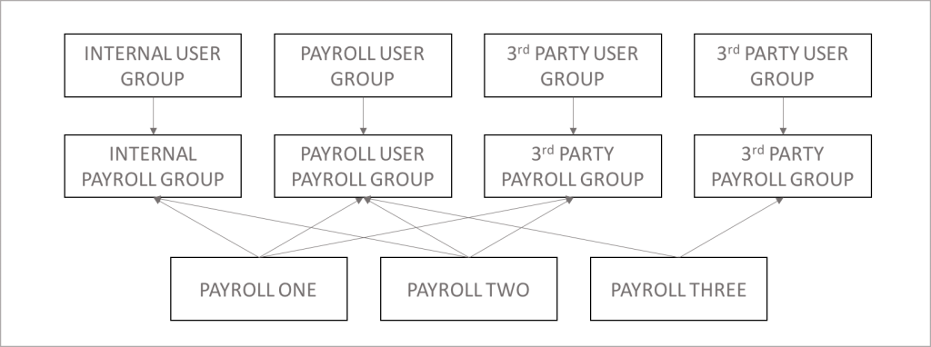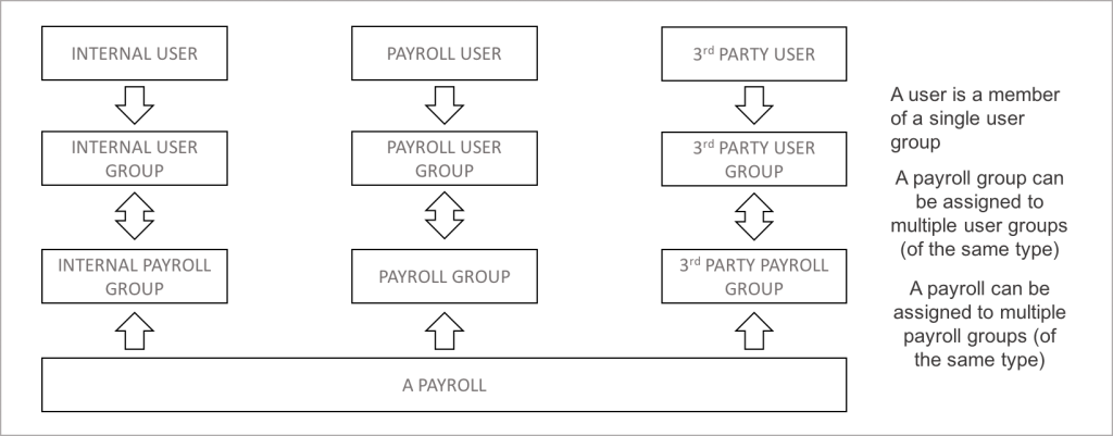 A payroll can be assigned to any number of payroll groups. The system provides a one to many relationship between user group and payroll group and a one to many between payroll group and payroll. As a result a user could have multiple paths to a payroll, so it is import to map the entire organisation. The path from user to payroll will impact their visibility to other users tasks, issues, reminders and notes, and their access to any file transfer folders.