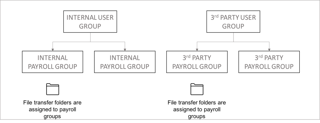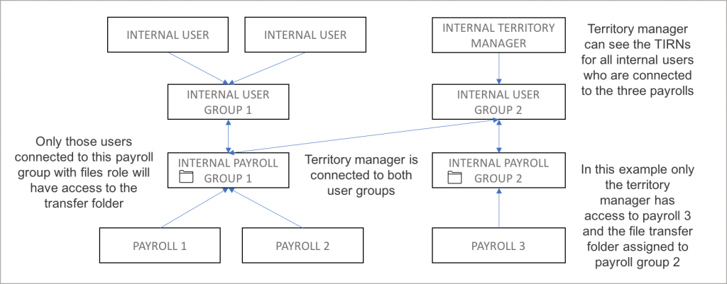 A user group can be assigned to one or a number of payroll groups. The structure chosen for a client tenancy will be influenced by the following rules. Internal users can only see the tasks, issues, reminders and notes of other internal users in their user group, unless they have been configured as an internal territory manager. The same applies to 3rdparty users, File transfer folders are assigned to payroll groups, for a user to have access to a particular transfer folder assigned to a payroll group, their user group has to be connected to that payroll group