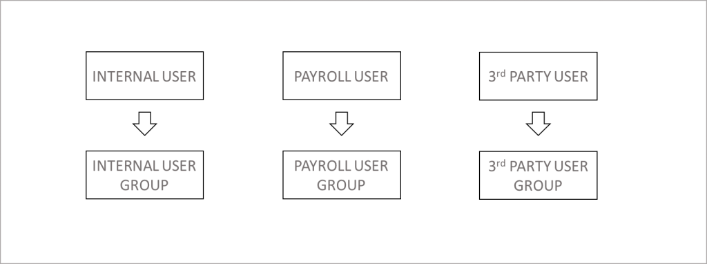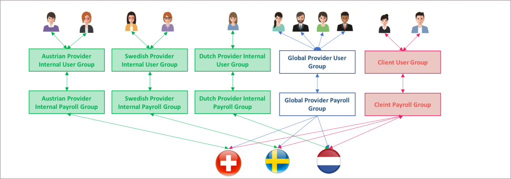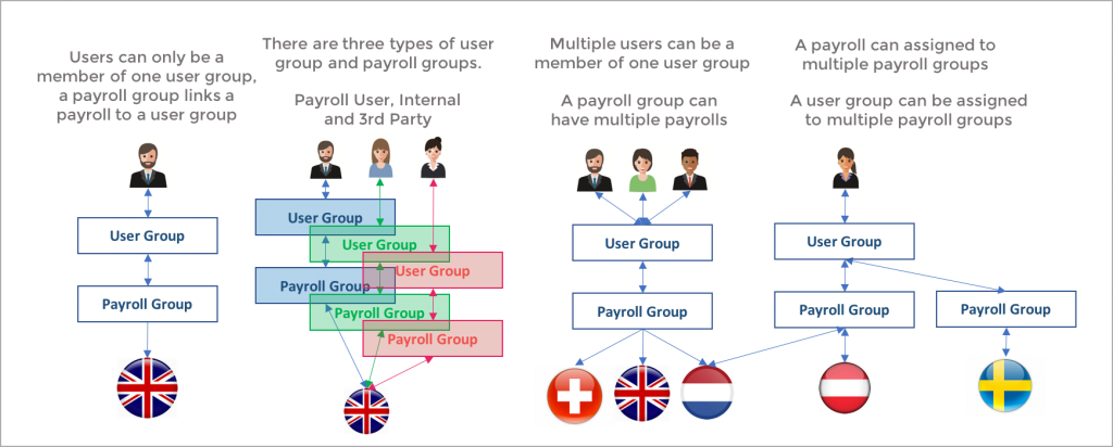 User types and user groups provides a framework to segregate organisations and teams within an organisation. The payroll users typically belong to the organisation driving and owning the global payroll process, this could be the global payroll provider or the client. 3rdparty users and internal users operate in the same way, and used to segregate the those organisations outside of the payroll users. Payroll users see and control everything, internal and 3rdparty users are restricted to their tasks and functions. The following is an example.