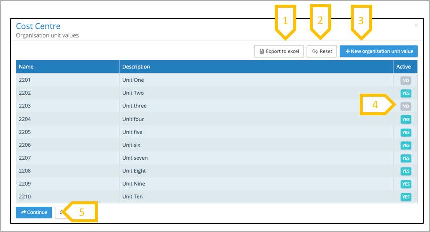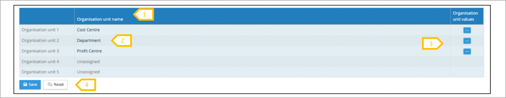 Organisation units are set up at a tenancy level, a value within a unit can be used in one or a number of payrolls. Each organisation unit has a list of permissible values (names), each of these can have a description. An organisation unit value cannot be deleted as it may have been used in a payroll, it can be made inactive.