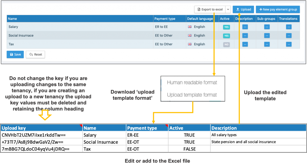 • The Excel download has a fixed number of columns and headings which are used by the system to upload the pay element groups, description and payment type.
