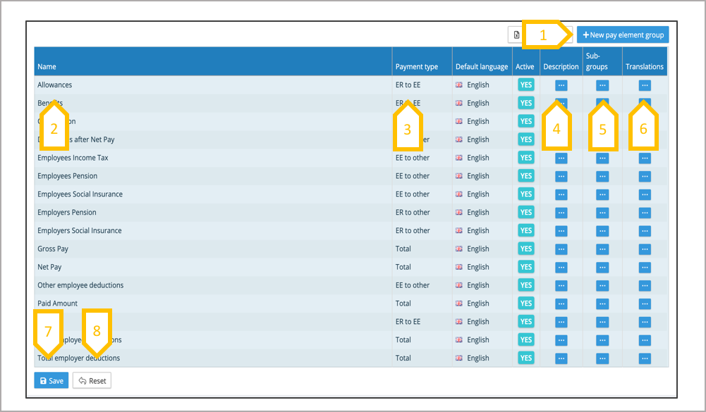 A pay element group has a name, this has to be unique. The pay element group name can be edited once created, please note if it has been assigned to a pay element on a payroll if the meaning of the name changes it will affect the global reporting. The system allows for multiple changes to be made to the list, these changes do not take effect until the save button has been actioned. Local pay elements which are of the same type vary in description, the pay element group and sub group defines them globally, it also defines the payment type.
