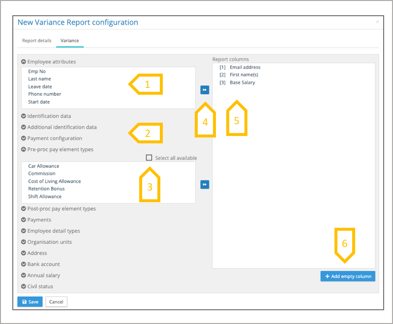 A report configuration determines the which employee attributes, employee details and pay elements appear in a report and the ordering of those columns. A report configuration has two tabs, report details and report columns.