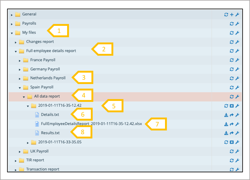 To access a report generated by the system, open files and select My Files. The system has a folder hierarchy of report type, payroll and report configuration. In each reporting folder, the system stores a file called details which contains the report parameters selected, results which lists if the report is successful or what errors had been encountered and the report.