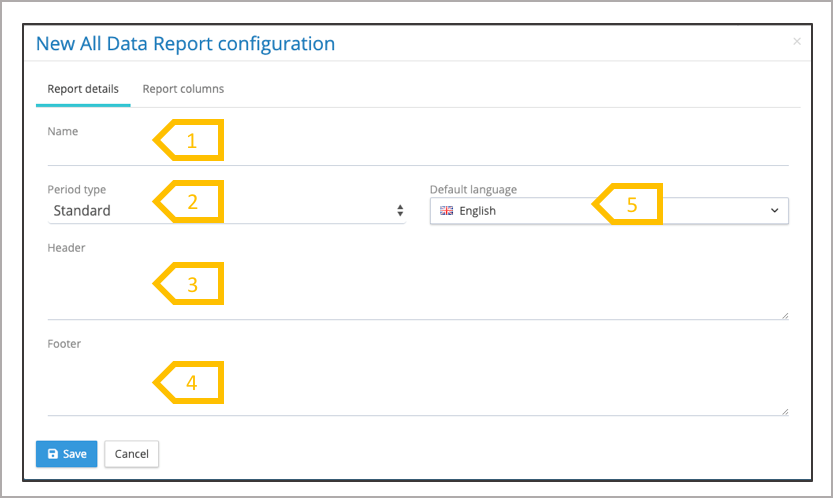 A report configuration has two tabs, report details and report columns. In the report columns tab, drag a drop the elements into the report column pane, positioning them in the order that they will appear on the report.