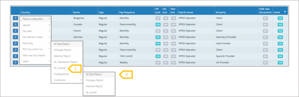 An All Data report enables a user with reporting permissions to generate a report that contains employee attributes, employee details, pre and post processing pay elements, payments for a given pay period. An All Data Report utilises one or more All Data report configurations. There are two steps to generating a report, select the report configuration, then select the pay period and language. The completed report is stored in My Files.