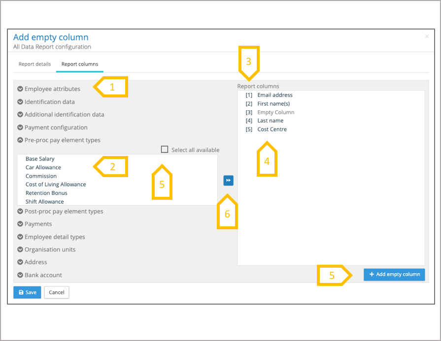 A report configuration determines the which employee attributes, employee details and pay elements appear in a report and the ordering of those columns. A report configuration has two tabs, report details and report columns.