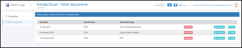 The employee view now has two menu items, payslips and other documents. Both views list documents by tax year, with a horizontal tab per year (Note the tax year tab appears when there are documents present in more than one tax year)