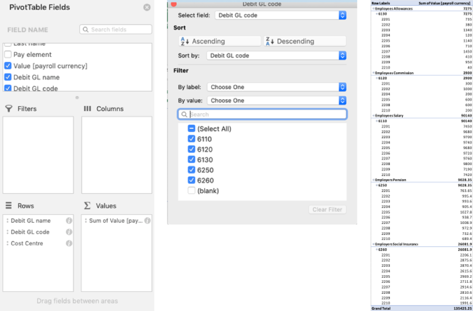 The following is a quick way to validate a Pay Element Code Configuration, ensuring that that the correct assignment of GL codes to pay elements have been made. Open the transaction report for a payroll and pay period and create two pivot tables, one for credits and the other for debits. The following example is based on a GL Journal which is grouped by GL Code and one organisation unit called Cost Centre.