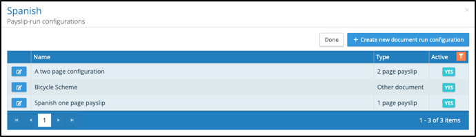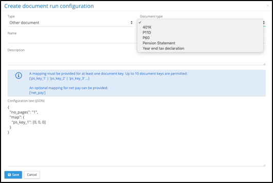 The payslip-run configurations have been replaced with PDF Document-run configurations. The configuration allows for the following types: