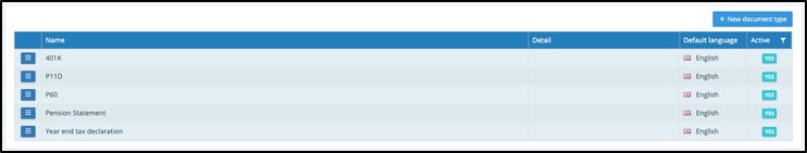 Document type is similar to other lookups, select ‘+ new document type’ to add a new type. Translations can be added to a document type and document types can be set to inactive so they cannot be selected in future ‘Initiate document runs’. The employee will continue to see and access any historic documents uploaded with the inactive document type.