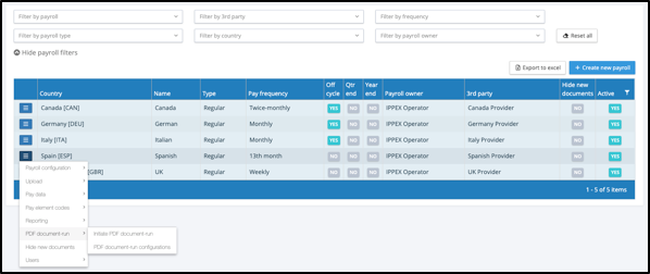 From a payroll action menu, you will see ‘PDF document- run’, this replaces the earlier ‘Payslip-run’. There are two options ‘Initiate PDF document-run’ and ‘PDF document-run configuration’. IPPEX Cloud provides the facility to upload PDF payslips and other PDF documents.