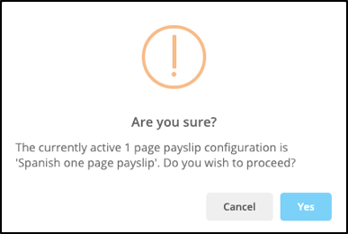 IPPEX Cloud will only allow one active configuration per payslip and other document types (other documents). The application will allow for any number of inactive configurations, to change the status of a configuration from inactive to active, click in the action button next to the configuration and change the status to active. When saving the change the application will present a warning, explaining if you save the configuration the existing active configuration will be changed to inactive. Similarly, if you are creating a new configuration for a payslip run that has an existing active configuration, the system will present a warning, explaining if you save the new configuration the existing active configuration will be changed to inactive.