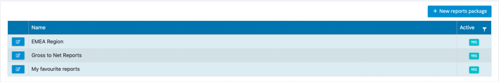 Under Reports on the main menu is a new item called Reports package, this has two sub menu items, Run Package and Configuration. Click on configuration and it will show all existing packages created and the ability to create a new reports package.