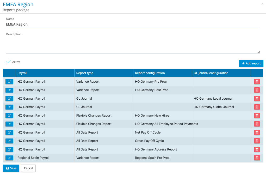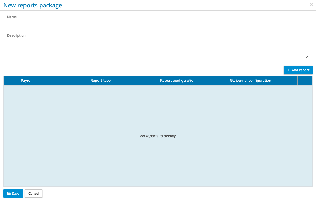 Click on New reports package. A reports package can be made up of any number of reports from any payroll.