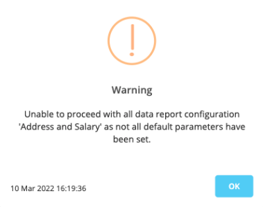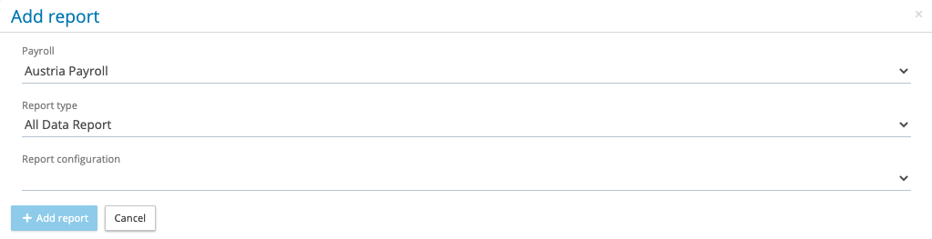 In the add report screen select the payroll, report type and report configuration, click on + Add report. Continue to build up your reports package until it is complete and then save. If you select a report that does not have the default report parameters set, you will get a warning and the report cannot be added to the package.