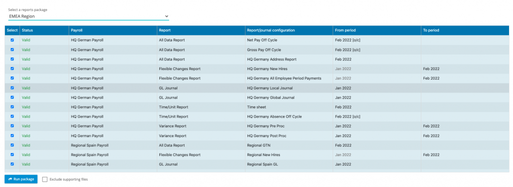 A reports package can be run from the payroll menu, using the action button next to the payroll, select reports > reports package. The system will only present those reports for that payroll within that package.