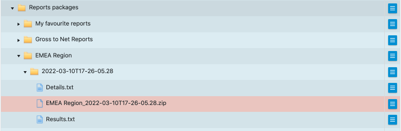 The reports package in My file has an overall details file containing the reporting selections and an overall results file for the package.