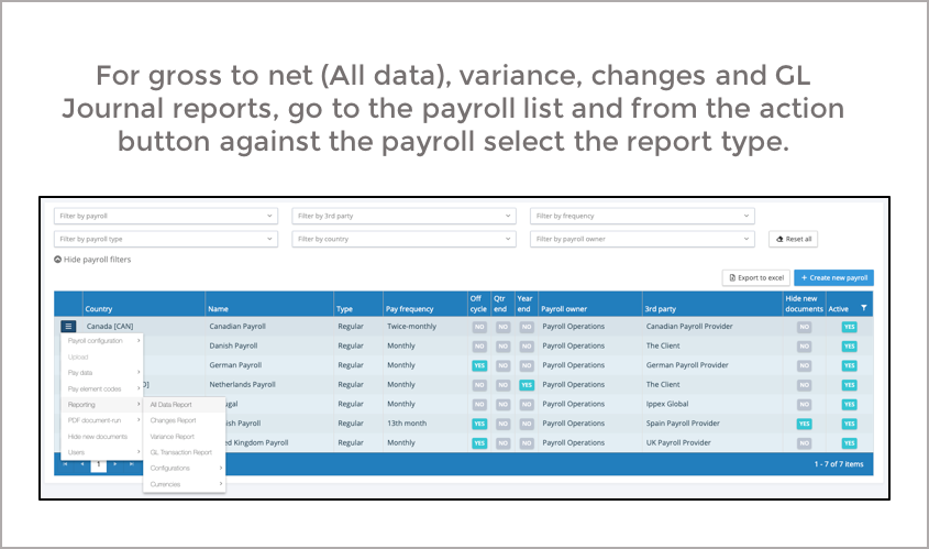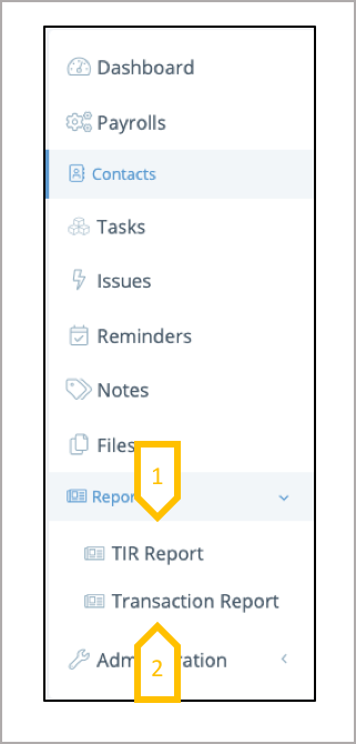 The system supports two groups of reports, multi-payroll and multi-period reports which are created from the Reports on the main menu, and payroll specific reports which are created from the payroll menu. From the main menu reports, there are two types a TIR report and a transaction report.