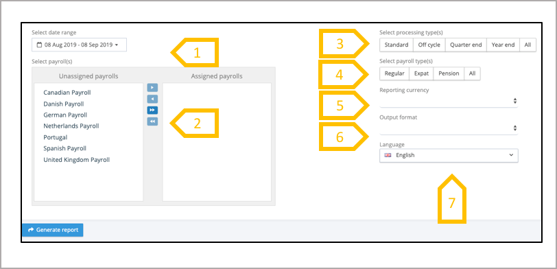 7. Reporting language – IPPEX Cloud will always report in the default language. If an alternative language is chosen, only those pay elements and pay element groups with the appropriate translations loaded will be reported with their translations, if no translation is available then the default language label will be reported.