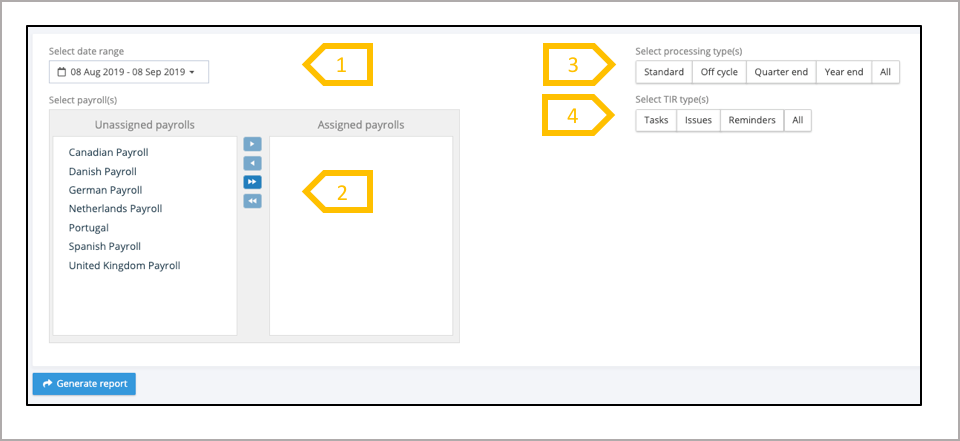 1. Date range – any pay period where the pay date falls within the selected date range will be included in the report.